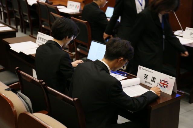 本次模拟联合国大会活动共有两场会议,分为上午场与下午场。上午场围绕“议题一:叙利亚局势:化学武器的问题”进行。下午场围绕议题二“化石燃料与气候变化‘危险’地不同步”进行。大会分为大会开幕,大会会议,大会颁奖三个主要环节。在大会开幕式上,观众们通过观看大会开幕式视频了解本次模拟联合国大会的重要意义与基本流程:分为主发言名单,正式辩论,非正式辩论以及程序性投票。大会会议进程中,13个全部正装出席的国家代表团在主发言名单中表现出色。日本代表用日语全程脱稿发言,神采奕奕;法国代表以及美国代表分别用法语与英语将立场向在场观众完整清楚呈现出来。大会翻译团的翻译清楚响亮。正式辩论与非正式辩论中,意大利代表、巴西代表、中国代表以及肯尼亚代表等国家代表出色地展现了所代表国家的真实风范,颇有外交官的气质。叙利亚以及俄罗斯联邦代表积极地提出动议,将各国需要讨论解决的问题提出来在会议上讨论。自由磋商进程中,所有代表走下位置互相之间积极讨论与交换意见,力图达成合作,以促进工作文件与决议草案的起草。上午场的会议虽然未达成有效性文件,但是在下午场气候有关议题上形成了有效的决议草案,由中国、俄罗斯、英国、法国、美国起草的决议草案获得绝对多数的赞同并通过。最后综合评委与主席团的评选结果,日本代表团斩获最佳代表团奖,其余国家代表分别获得最佳代表,杰出代表,优秀代表等奖项。