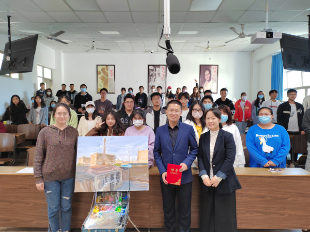 活动先由曹老师介绍主讲嘉宾,随后李老师分享自己的艺术创作之路,他讲述了自己油画创作的历程,带大家赏析油画作品,同时鼓励在座绘画爱好者坚持梦想。接着,李老师在现场示范画作,他先是用画笔定下了画面的大概位置,然后由整体到局部,由局部到细节依次创作,完成了一幅精美的风景油画作品,由此可见李老师的画功深厚,大家看的入神,十分敬佩,教室里安静的只剩下画笔的声音。随后李老师落笔题名,完成创作,场内响起阵阵掌声。