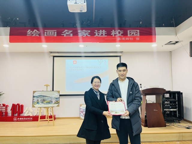 范老师以《从古典到当代——简述西方美术发展与我的艺术创作》为主题,向同学们讲述了西方美术史代表作品,分享了自己的绘画创作经历。在综合材料绘画创作展示阶段,范老师在现场示范作画并让同学们积极参与创作过程,鼓励同学们发掘自己的潜力,表达自己的内心世界。他希望同学们能够保持对艺术的热爱,不断提升自己的绘画水平。最后,由校团委郑月圆副书记为范老师颁发聘书。
