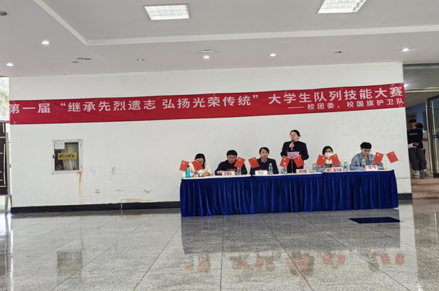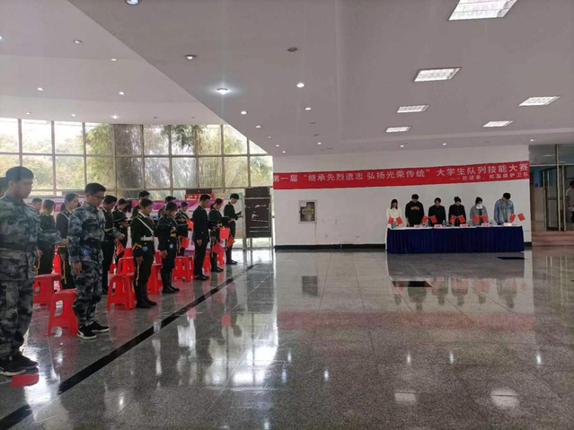 为了缅怀和致敬革命先烈,以红色基因筑牢广大学生的“中国红”信仰,用青春臂膀扛起保卫国家安全职责,清明节前夕的4月2日下午,学校首届“继承先烈遗志发扬光荣传统”大学生队列技能大赛在教三大厅鸣锣开赛。校团委书记郑月圆、校人民武装部副部长徐锋等领导、老师和国旗护卫队全体学生80余人参加了此次比赛。