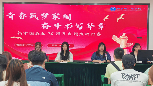 9月23日晚,物联网工程学院团总支在图C-401成功举办了以”青春筑梦家国,奋斗书写华章”为主题的新中国成立75周年演讲比赛。本次活动由陈曦与葛星星两位老师指导,团学委员担任评委,洪莹同学主持,吸引了60名观众热情参与。
