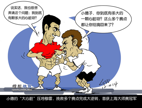 北京时间10月14日,2012赛季ATP1000赛上海大师赛进入到最后一日较量。男单决赛,塞尔维亚天才德约科维奇苦战3小时21分钟,以5-7/7-6(11)/6-3大逆转两届赛会冠军、英国名将穆雷,首次获得该项赛事冠军,这不仅是小德生涯第500场胜利,也是赛季第五冠,职业生涯的第33个单打冠军。
