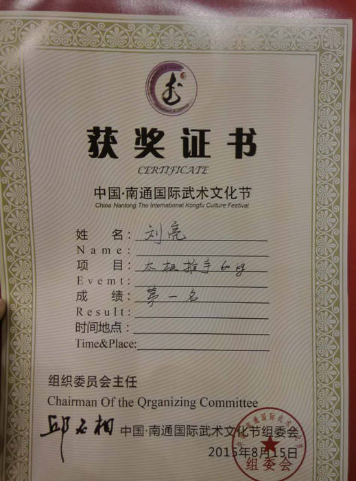 9月11日,首届南通国际武术节拉开帷幕,来自国内外37支代表队的800名武术选手参加了此次比赛,刘亮同学再获骄人战绩,在太极推手比赛中击败来自北京体育大学的选手,获得男子60KG级冠军。