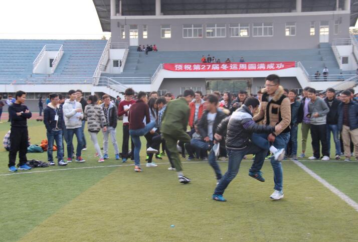 在简短的开幕式后,随着一声发令枪响,近4000人参加的环校长跑活动拉开了本届“冬运周”的序幕,比赛分长跑、拔河、齐心协力、踩气球、集体跳绳等10余项集体项目和飞镖、踢毽子、托球跑、呼啦圈等12项个人项目,此次“冬运周”活动将持续一周。