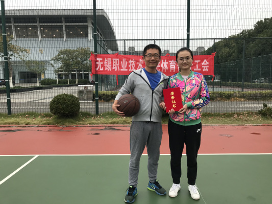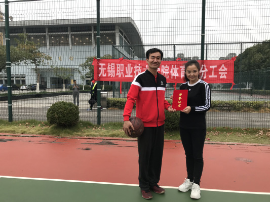 体育部党支书记吴斌老师为一分钟投篮女子冠军董爱霞颁奖