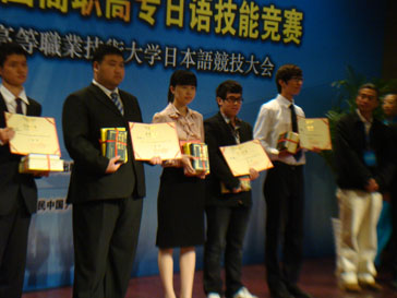 第一届全国高职高专院校日语技能大赛于10月12日圆满落下帷幕,教育部高等学校高职高专其他语言类专业教指委主任刘德章等出席了开、闭幕式。商务日语61032班胡一栋同学荣获个人赛项“日语演讲”一等奖,商务日语60932班张蒙蒙同学荣获三等奖,由张蒙蒙、蔡佩青(商务日语60932)、万玲玲(商务日语61031)、胡一栋同学所组成的团体队荣获团体赛项“日语情景剧”表演二等奖,同时我校还荣获优秀组织奖。我院参赛代表团由商务日语教研室主任杨学江任领队,日本外教畠山悦子为参赛顾问及上述四名同学组成。经过两天的激烈角逐,我院代表团不负众望,取得了优异的战绩。