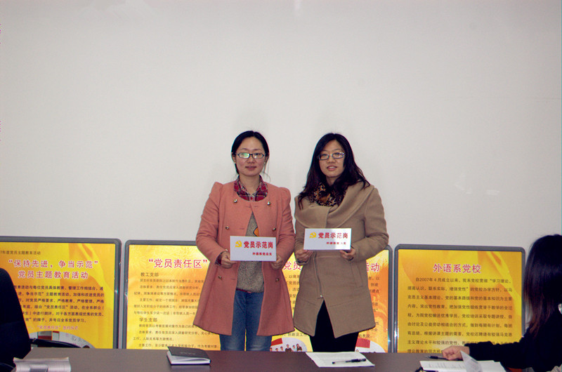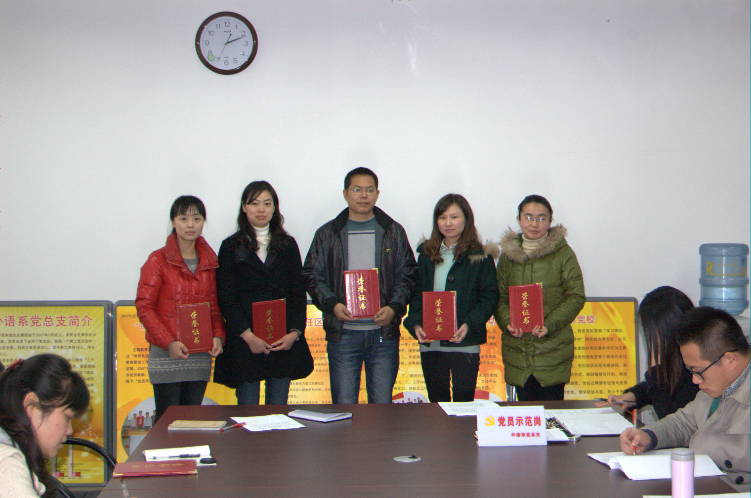 3月26日下午,外国语言文学系党总支组织召开了全体党员大会,围绕“系部不落后、党员争优秀”主题,分别表彰了5名“优秀共产党员”和5名“责任区工作先进个人”,并为两位成功创建“党员示范岗”的教师党员换牌。