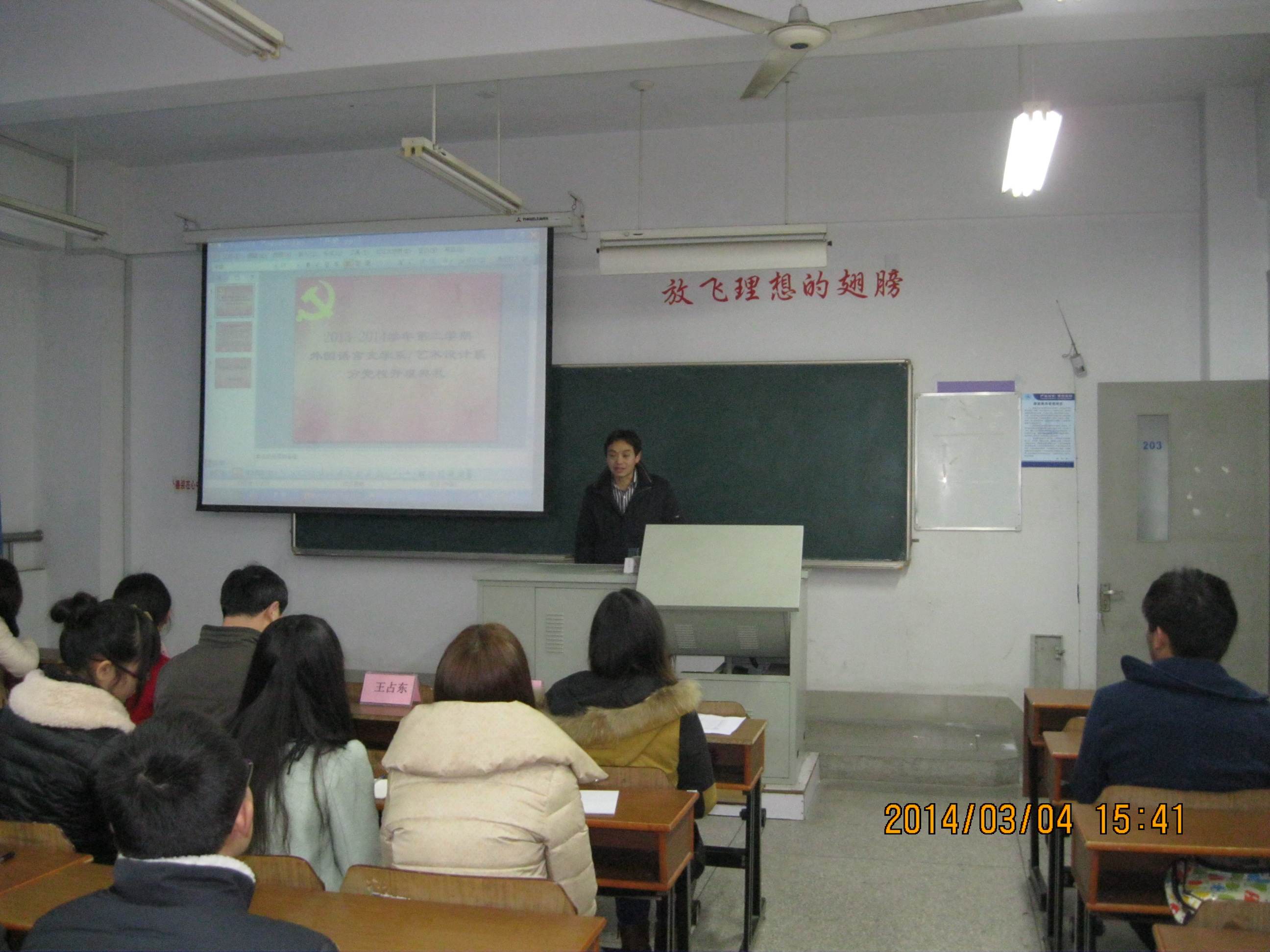 2014年3月4日15时30分,外国语言文学系/艺术设计系2013-2014学年第二学期分党校开班典礼在教3-203教室隆重举行,外语系党总支书记王占东、艺术系党总支书记刘文平、艺术系学生党支部书记李湘、外语系学生党支部书记周嫄等5位老师和66名学员出席了本次活动。