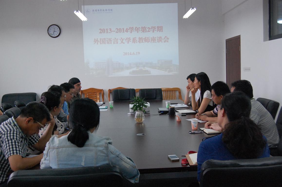 6月19日下午,外语系在国际交流中心604会议室召开了2013-2014学年第二学期教师座谈会。外语系党支书记王占东、主任杨丽和24位教师代表参加了会议。会议由外语系主任杨丽主持,教务处副处长倪卫东、质控部副主任黄乾平出席了会议。