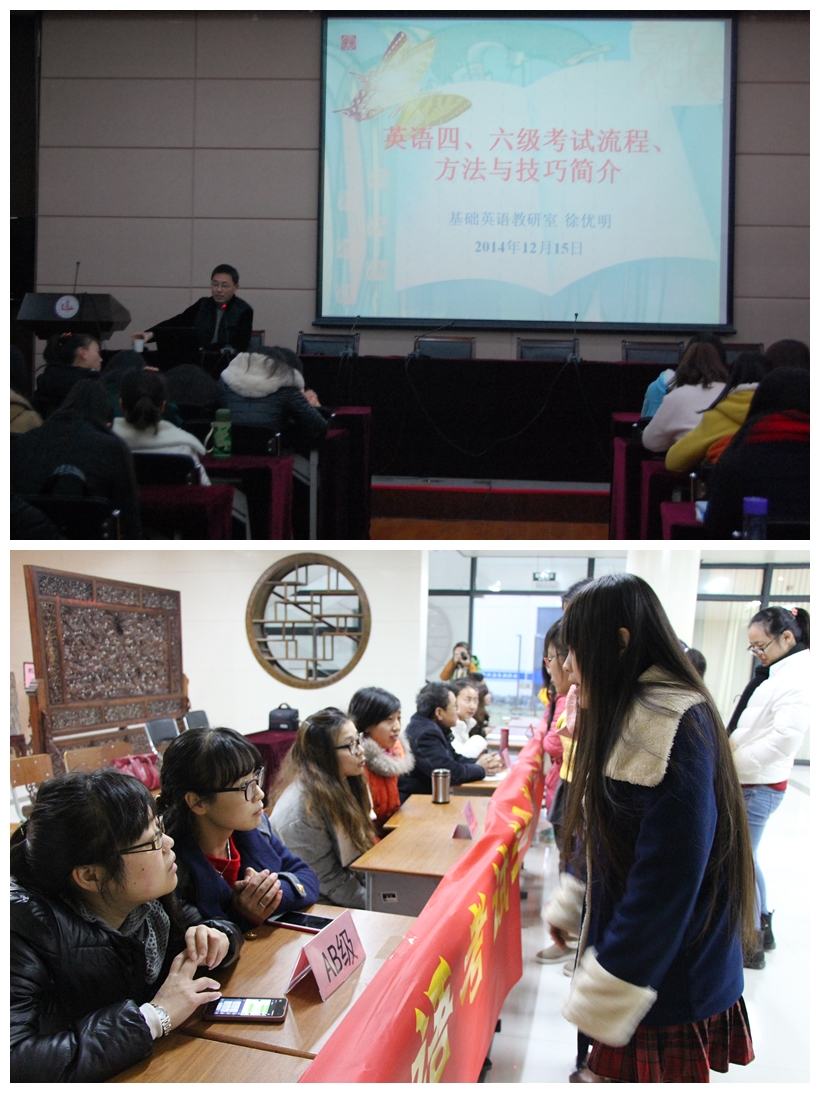 1215日,在即将迎来全国大学英语等级考试之际,外语系党总支开展了外语考级考证志愿服务专题党日活动。活动分为两部分。外语系基础英语教研室负责人徐优明老师做了大学英语等级考试迎考准备及问题解答的讲座。徐老师与同学们分享了多年的教学经验以及考试感悟,并亲切的与大家进行互动问答,解答了大家对于英语等级考试的困惑,现场的气氛相当活跃。