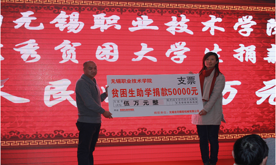 2015年02月07日,无锡吉冈精密机械有限公司捐助玛雅吧 外语与旅游学院优秀贫困生的仪式在公司年会上举行。公司总经理周延先生代表董事会向我院的优秀贫困生捐助现金伍万元,外语与旅游学院杨丽院长代表我院接受了这一捐赠。