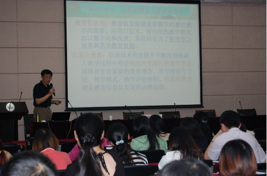 讲座中,李霄翔教授聚焦主题,深入阐述了互联网+时代教育理念的创新与变革、教学模式与教学手段的创新与变革、教师职业的学术结构性调整和信息化环境下大学教育的思考等方面;并从信息化进程中大学教师职业的反思和信息化环境下学习的特点等角度,就英语教师、高校教师如何应对挑战提出了一些应对策略。