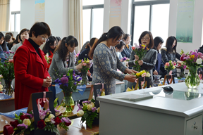 插花艺术,是将修剪下来的植物枝、叶、花、果等作为素材,经过一定的艺术加工,重新配置成精美、诗意,重现自然美和生活美的艺术品。本次活动由精通东西方插花艺术的专业插花艺师进行现场传授指导,从插花艺术的起源、发展、文化、分类、工艺等多个方面,对插花进行了简单的介绍,并对插花的基本方法进行了现场演示和讲解。全院五十多位女教师们进行了认真地学习和体验,在插花老师的指导下,动手完成自己手中的“艺术品”。活动期间,不少老师拿出手机,拍下一幕幕美丽的场景。