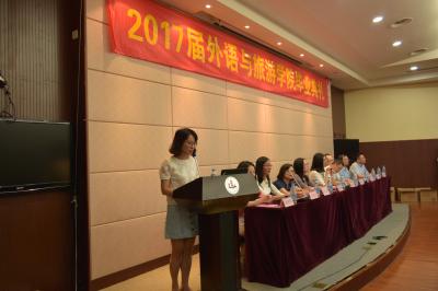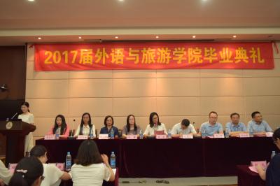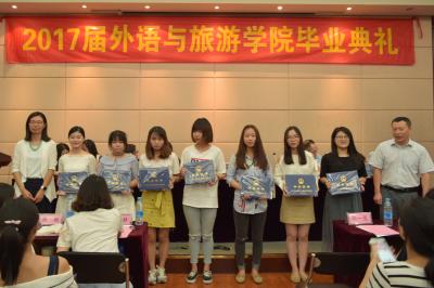 6月16日14时,外语与旅游学院在太湖校区国教二楼报告厅隆重举行“2017届毕业生毕业证书发放仪式”。外语与旅游学院院长杨丽、党总支书记王占东、副院长冷静、院长助理梁峰、各教研室领导、全体班主任、辅导员以及外语与旅游学院2017届全体毕业生参加了本次仪式。仪式由外语与旅游学院商务英语61431班毕业生程岩主持。