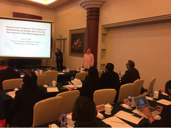 10月17日至18日,由印尼旅游与酒店管理专业高校联盟、无锡市国际教育交流合作协会主办,我校承办的第四届旅游与酒店管理国际学术研讨会在无锡君来湖滨饭店隆重举行。这次会议吸引了来自印尼、马来西亚、瑞士及中国的近200位代表参会。我院酒店管理专业教师刘娟应邀在会上报告了其学术论文“Chinese Hotel Employees’ Perceptions of Multitasking and Display Rules: How Do They Influence Their Work Engagement?”。报告引发了与会代表的兴趣和相关讨论。