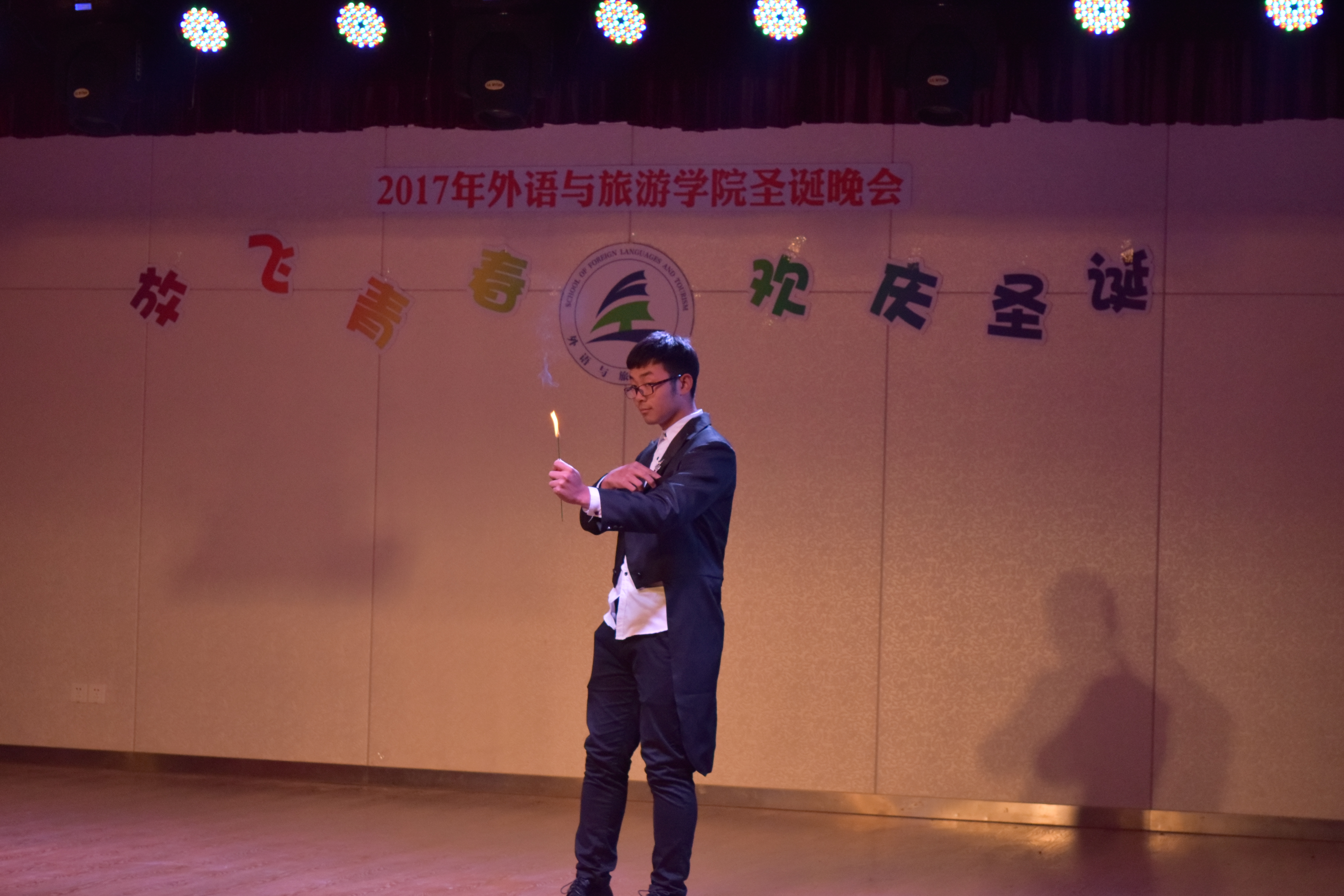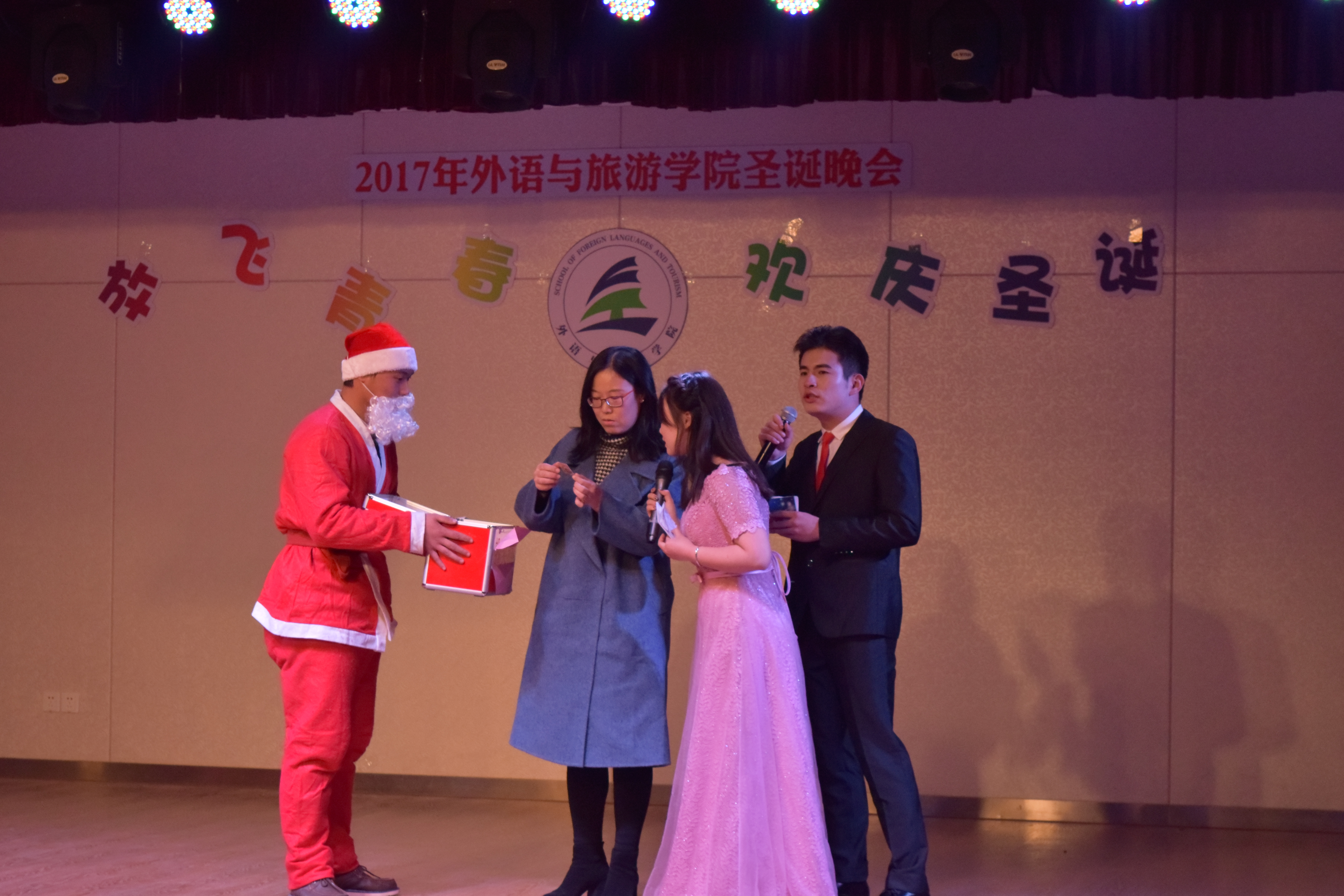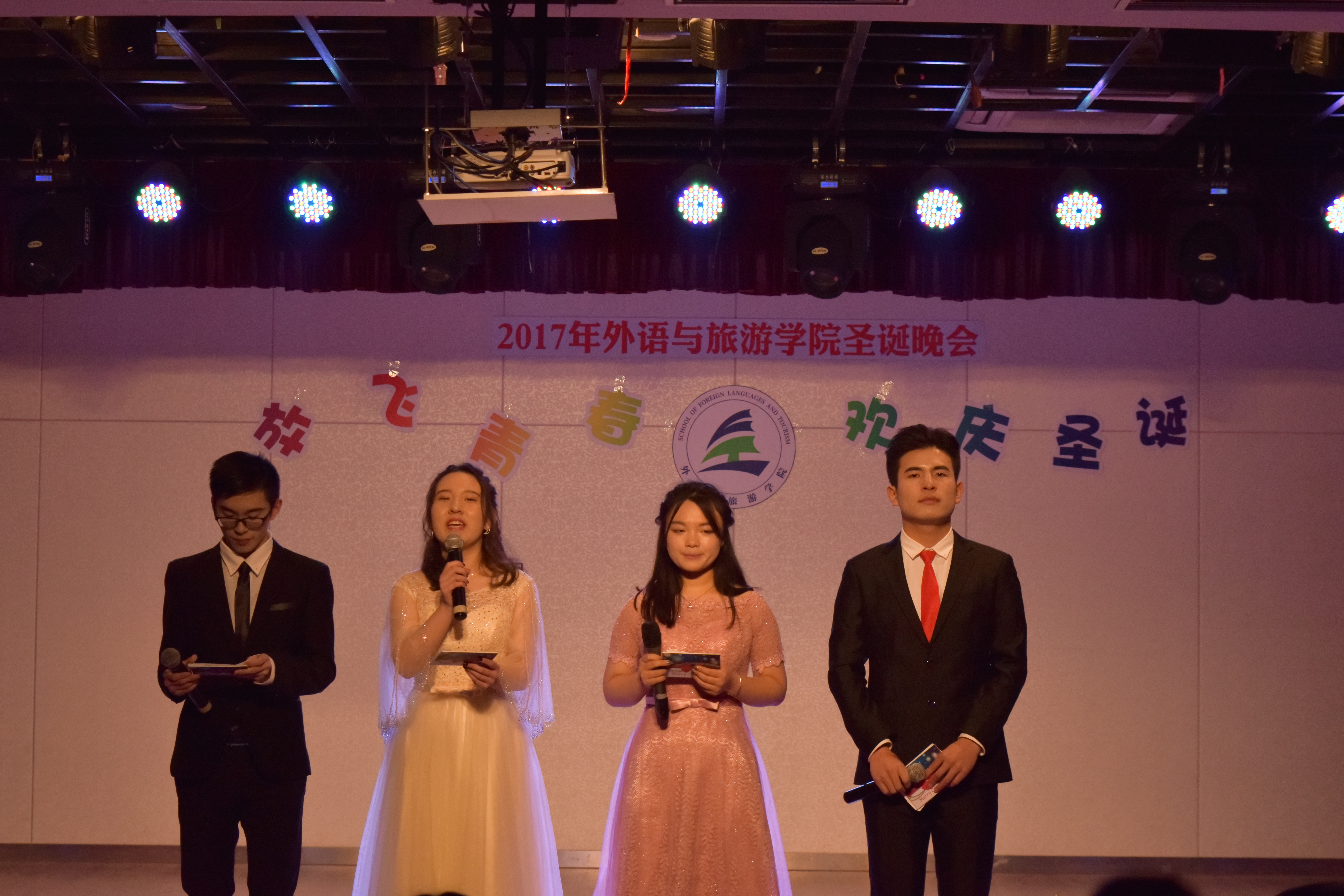 12月21日晚七点半,由外语与旅游学院举办的“放飞青春,欢庆圣诞”文艺晚会在青春剧场盛大开幕。出席本次晚会的嘉宾有外语与旅游学院党支书记王占老师,副院长冷静老师,各兄弟学院分团委书记、辅导员,外语与旅游学院教师代表和留学生代表,400多名师生欢聚一堂,共享视觉盛宴。