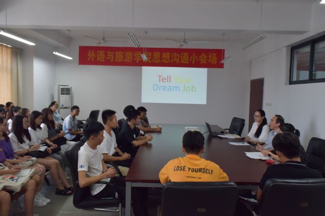 为帮助毕业班学生更好的进行职业规划,促进毕业班学生就业,9月19日中午,外语与旅游学院在学院会议室开展了以“规划人生,畅想未来”为主题的职业理想漫谈思想沟通小会场。外语与旅游学院党总支书记江铭、学工办辅导员、班主任代表、对就业和职业迷茫的毕业班同学参加了此次思想沟通活动。