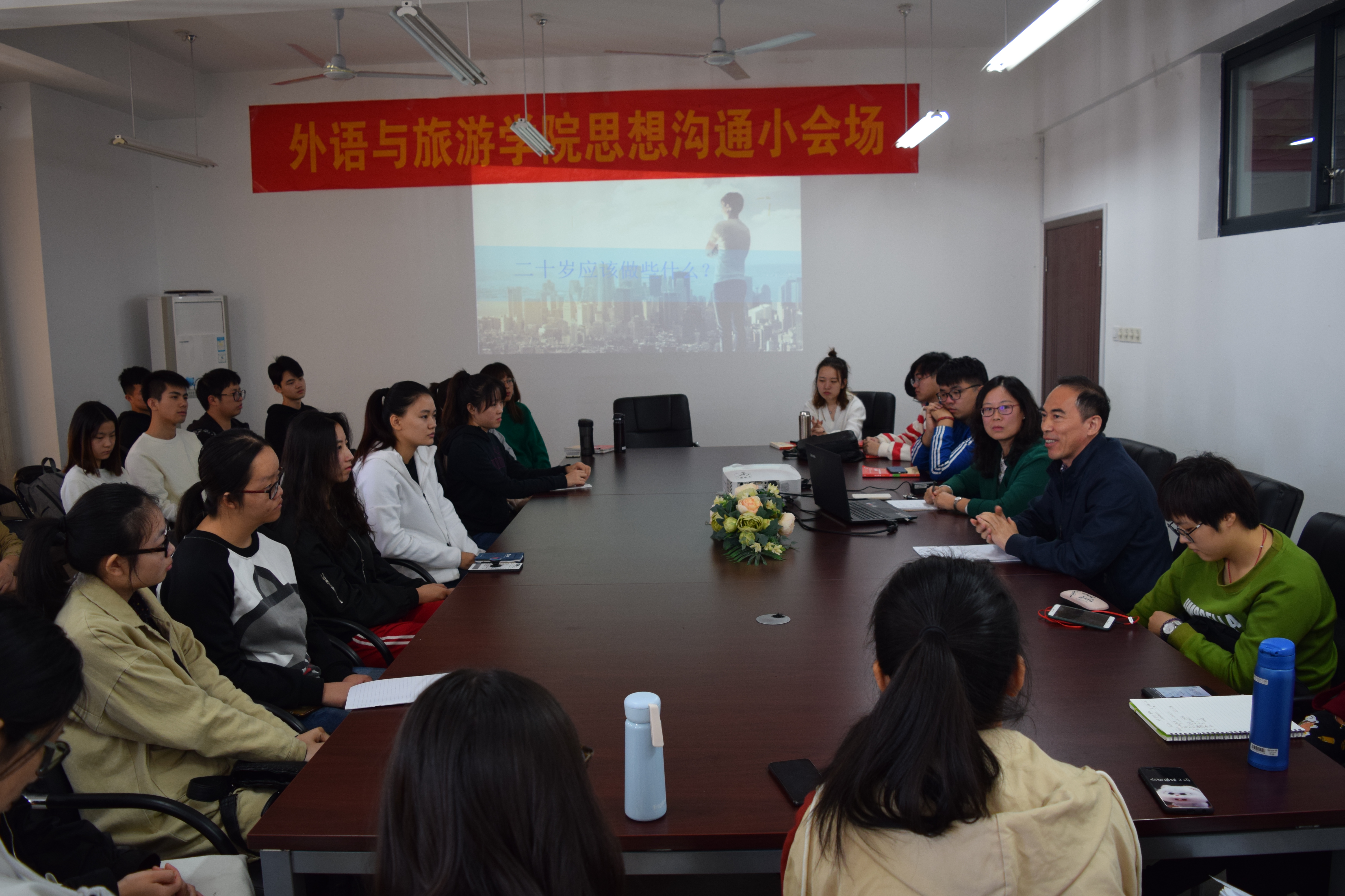 二十岁,何人不迷惘?二十岁,一个青涩与成熟并存的蜕变期,破茧成蝶的过程中,我们应该做些什么?11月1日上午,外语与旅游学院在国际交流中心604开展了以“二十岁应该做些什么?”为主题的思想沟通小会场。外语与旅游学院党总支书记江铭、班主任冷静老师、学工办辅导员,以及商务英语3+2班学生代表参加了此次思想沟通活动。
