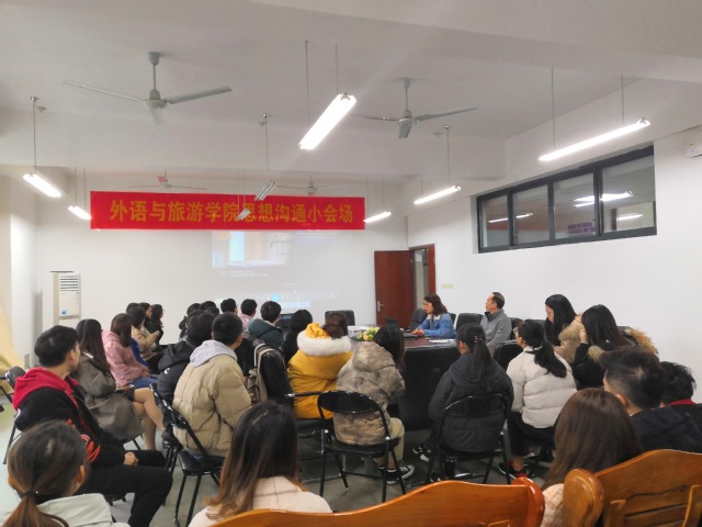 高校承载着立德树人重要使命,为帮助即将走向工作岗位的同学形成正确的价值观念,树立良好的职业道德。12月6日上午,外语与旅游学院在国际交流中心604开展了以“职业精神”为主题的思想沟通小会场。外语与旅游学院党总支书记江铭、班主任许静老师、学工办辅导员,以及旅游管理61632班学生代表参加了此次思想沟通活动。