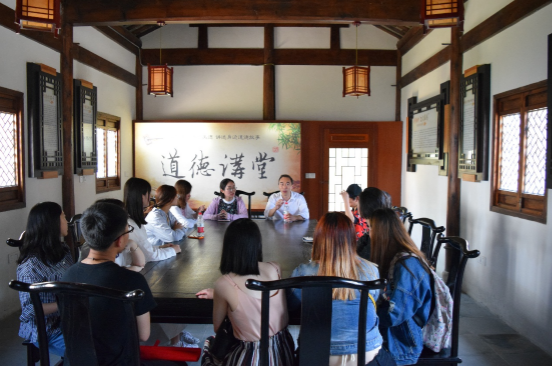 在蒋山村,师生们走访了解了村风村貌,重点参观了村委会、何氏宗祠、蒋山书舍等地。村委会办公地有关村史、村规、家规、党群关系等的宣传介绍让大家更深入地了解了“江苏最美乡村”的风貌。在何氏宗祠,热心老村民的讲解让师生们看到了何氏家族“忠、孝、廉、节”家风的传承与延续。党总支江铭书记因地制宜,利用“道德讲堂”现场与学生们开展了一次有关中华传统文化的沟通小会场。淳朴的村童、设计独特的农家书屋“蒋山书舍”也让大家印象深刻。