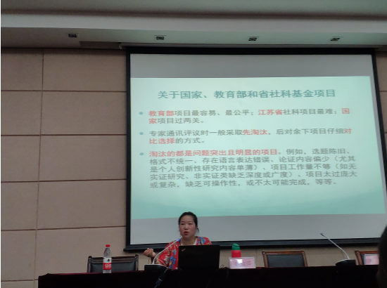 6月13日下午,江南大学外国语学院张俊萍老师应邀来我院为教师们开展了高校教师科研指导讲座。张教授迄今为止独立完成或以第一作者发表论文40余篇;出版比较文学和叙事文学方面专著各1本;参编国家级规划教材1本、西方现代文论双语教材1本;主持国家社科一般项目“消费主义伦理在20世纪初美国小说中的肇始与建构研究”、教育部人文社科青年项目“消费主义的兴起与20世纪20年代美国小说研究”、江苏省社科规划办社科基金青年项目“中英关系逆转时期自我对他者的认知心态研究”等多个项目。