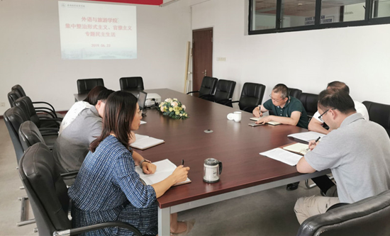 按照学校《关于召开集中整治形式主义、官僚主义专题民主生活会的通知》要求,6月23日下午,外语与旅游学院召开了集中整治形式主义、官僚主义专题民主生活会。会议由党总支书记江铭主持,学院领导班子成员(中层正副职党外干部和助理干部列席会议)、总支委员参加了会议,联系校领导强伟纲副院长出席会议并作指导讲话。