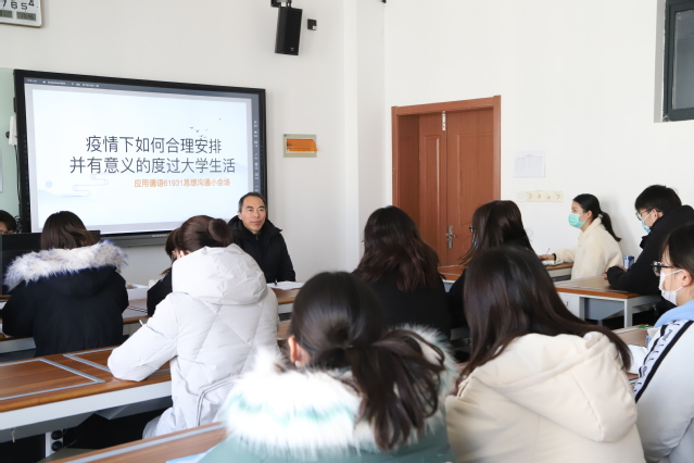 2020年12月31日下午13:30,围绕“疫情下如何合理安排并有意义的度过大学生活”的主题,外语与旅游学院应用德语61931班全体学生在国教508开展了思想沟通小会场,外语与旅游学院党总支书记江铭、辅导员赵艳华、班主任雷蕾,参与了此次讨论。