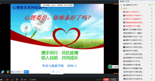 2020年5月22日,为进一步推动学院心理健康教育工作顺利开展,更好地普及防疫心理健康知识,外语与旅游学院心理辅导员赵艳华老师于5月22日通过线上网络平台直播的方式对学院心理委员进行了以“携手同行,共抗疫情”为主题的心理培训。18、19级心理委员以及心理部成员参加了本次培训会议。