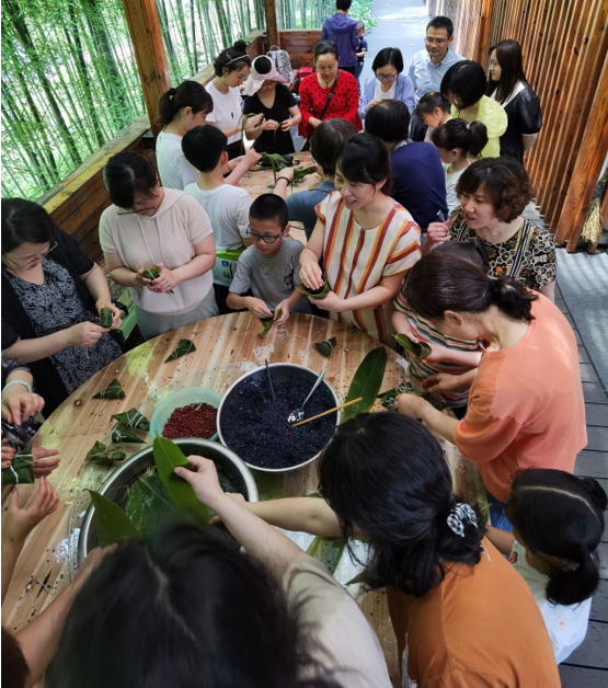 下午,大家齐聚竹林下参与了包粽子活动。此次活动请了白塔村包粽能手黄阿姨手把手教,展示了多种包粽子方法。大家跃跃欲试,纷纷动手,在阿姨指导下,大部分老师都包出了有模有样的粽子。