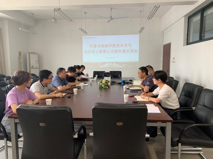 2021年6月7日,外语与旅游学院党总支与机关党工委第三支部组织开展了党建共建交流会。外语与旅游学院党总支委员会委员、机关党工委书记徐晴、学生处处长徐悦、机关党工委第三支部书记赵健及支委参加了会议。会议由外旅学院党总支书记郭再泉主持。