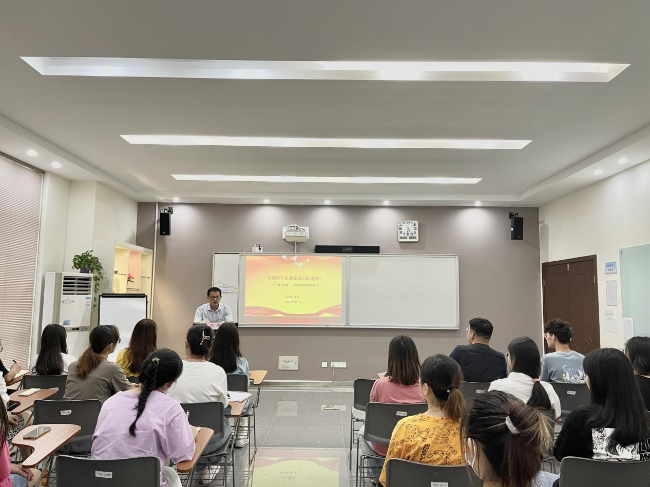 2021年7月1日晚,在全国上下热烈庆祝中国共产党建党百年的氛围中,校纪委书记徐浪为外语与旅游学院学生党员和入党积极分子们讲授了一节党史学习专题党课。徐浪书记以《中国为什么要走自己的道路?》为题,深刻叙述了1921至1935的中共革命历史,围绕“走什么样的革命道路”、“为什么走这样的道路”、“如何走好这条道路”,运用丰富的人物事迹和历史事实,将革命发展脉络完整串联,形象生动地向学生党员和积极分子们阐述了中国共产党顺应历史发展规律和大势,团结带领中国人民不懈奋斗的光辉历程,总结党在这一关键历史时期创造的理论成果、积累的宝贵经验、铸就的伟大精神,阐明党为中华民族作出的伟大贡献、为解决人类问题提供的中国智慧中国方案,展望党和人民事业发展的光明前景。