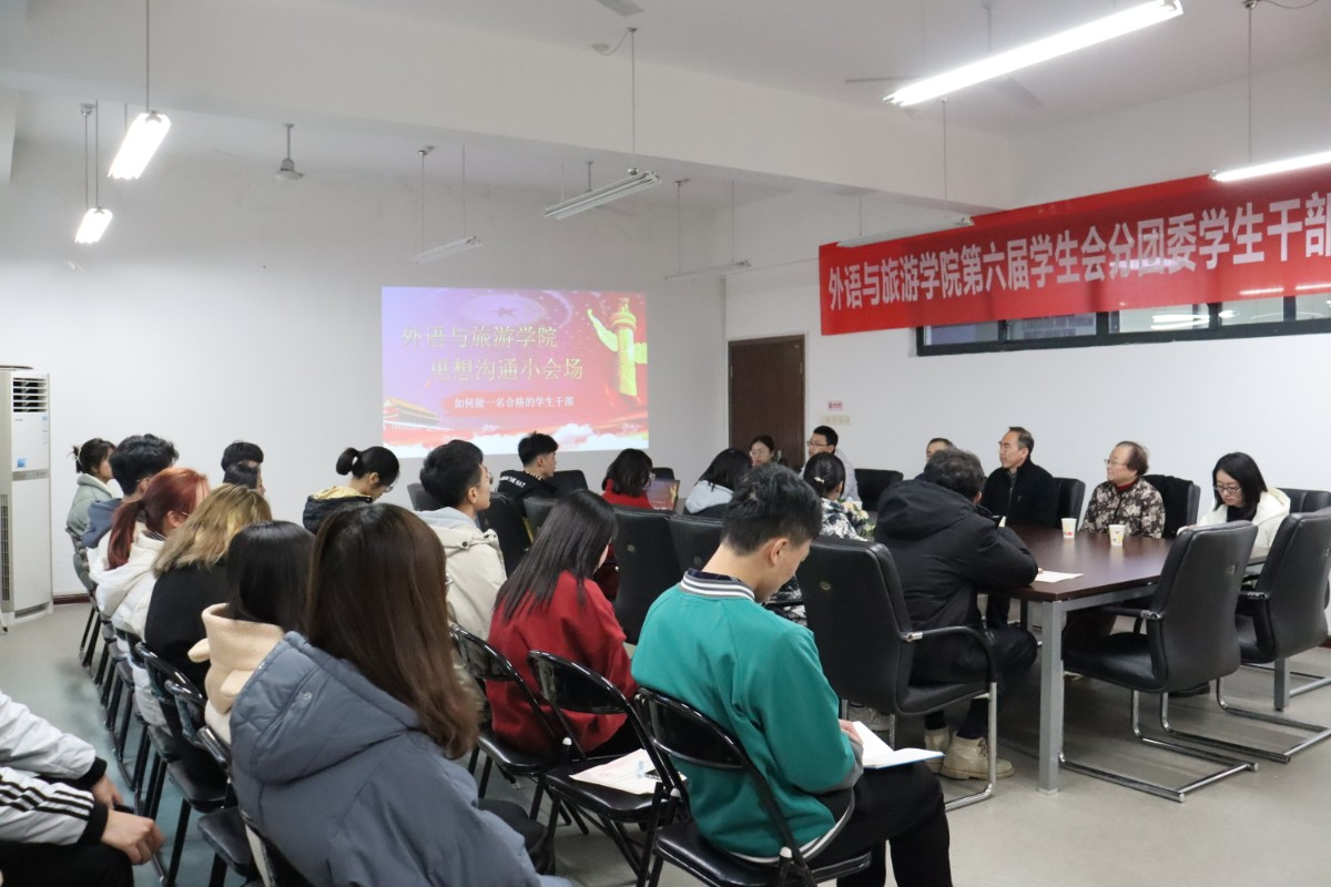 2020届学外语与旅游学院思想沟通小会场于2020年12月7日下午15:30在国际交流中心六楼604室举行,本次会议由沈国农老师主持,围绕”如何做一个合格的学生干部“这个主题开展讨论。此次会议出席的老师有学院党总支书记江铭、关工委曹承志老师、顾惠邱老师、储战平老师、外旅学院学工办主任周嫄老师、外旅学院辅导员老师沈国农老师参加,参会同学有外旅学生会主席团及各部门负责人。