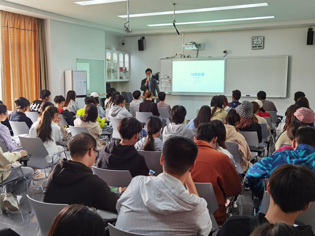 10月21日下午,为深入实施大学生创业的引导,做好大学生创新创业教育,外语与旅游学院特邀原酒店管理41231班毕业生箫栋,现任无锡市欣逸东制药化工设备有限公司总经理为广大学生作了题为“10年分享”的专题讲座。讲座由学院党总支副书记周嫄主持,学院各专业七十余名学生在国教505聆听了报告。