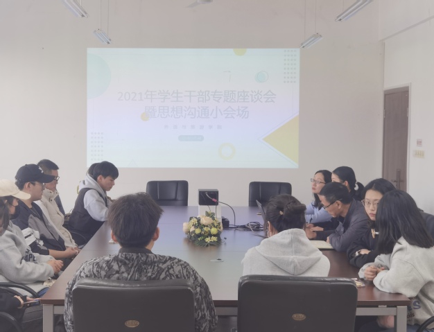 为更好地了解青年学生的思想动态,充分发挥学生干部的带头作用,11月9日下午,外语与旅游学院组织召开学生干部座谈会暨思想沟通小会场。分院党总支书记郭再泉、副书记周嫄出席会议,学工办老师及21名学生干部参加会议,