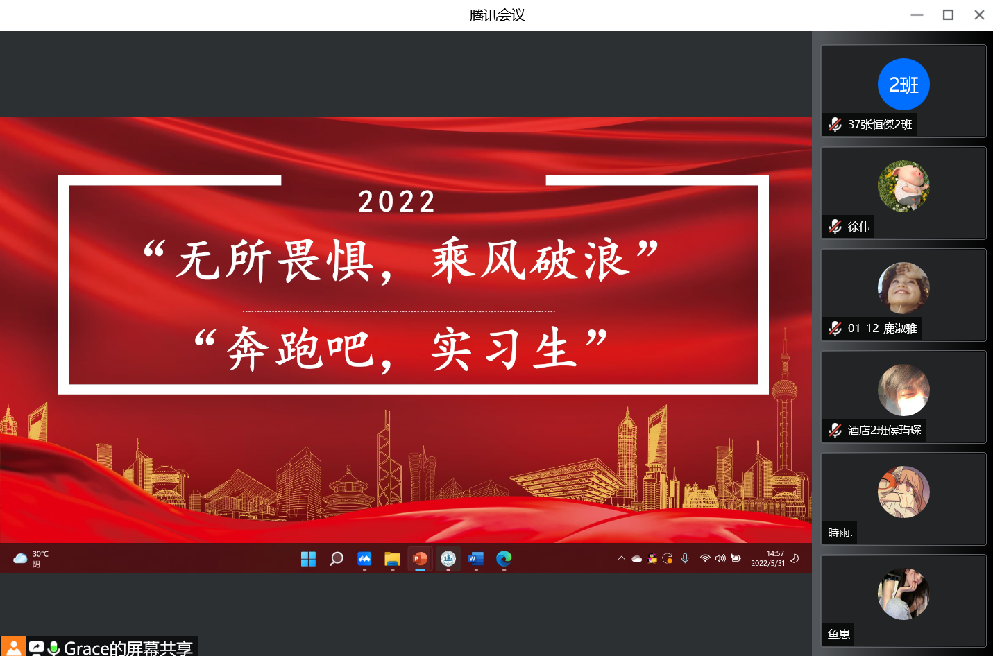 2022年5月31日下午,外语与旅游学院党总支副书记周嫄老师,专业教研室李娟梅老师、叶业老师,辅导员刘蕾老师和2020级全体酒店管理专业同学在线开展了“勇往直前,乘风破浪”为主题的思想沟通小会场。