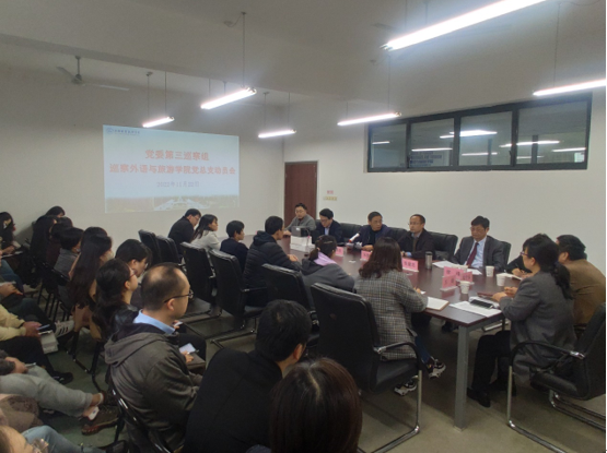 11月22日,党委第三巡察组召开动员会。巡察组副组长宋静辉代表组长周春兰就即将开展的巡察工作作动员讲话,总支书记郭再泉主持会议,并代表外语与旅游学院领导班子就贯彻落实巡察组要求、配合做好巡察工作作了表态发言。党委第三巡察组成员,外语与旅游学院班子成员,全体教职工、学生代表参加会议。
