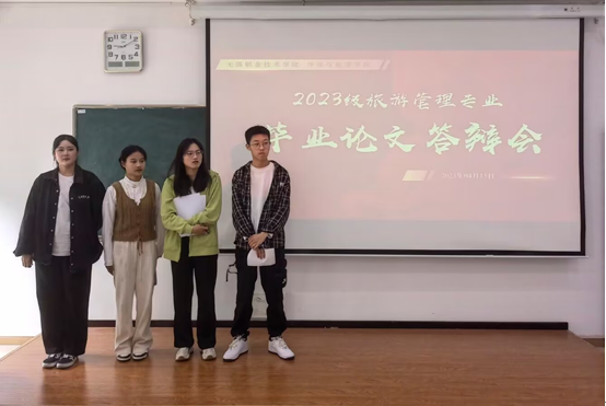 415日上午,旅游系2023届毕业设计答辩在国际交流中心四楼实训室举行。旅游管理专业和酒店管理专业150名毕业班学生在指导老师的指导下,经过8周奋战,经历选题、撰写开题报告、撰写论文初稿、完成论文正稿、查重等环节,按时完成毕业设计任务,如期参加答辩。