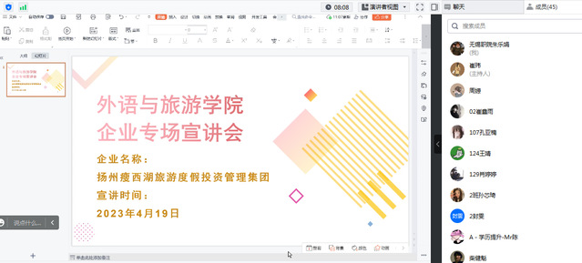 首先,周嫄对企业及宣讲人员表示欢迎并对宣讲会的议程进行了介绍。接下来扬州瘦西湖旅游度假投资管理集团办公室主任杨超通过宣传片,介绍了集团的主营业务,集团规模,品牌定位门店布局以及公司产品等情况,帮助同学们深入了解企业。同时杨超主任结合个人职业发展经历分享了其关于就业城市选择及行业选择的观点。随后,外语与旅游学院的同学们就工作时间,福利待遇及岗位内容职责进行了踊跃提问,杨超主任也给予了耐心细致的回答,表示企业会为新进员工提供专业的培训、广阔的平台和全面的福利保障。欢迎同学们加入,为企业发展注入新鲜活力。