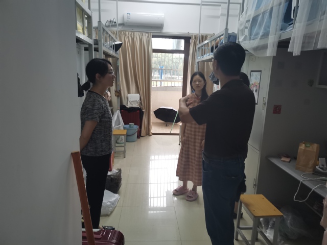 为关心我院新生生活状况,深入了解新生需求,进一步落实我院“4321青春同行”一站式学生社区管理模式,9月14日下午,外语与旅游学院党总支书记郭再泉、副书记周嫄以及辅导员高枫雯老师走访2023级新生宿舍。