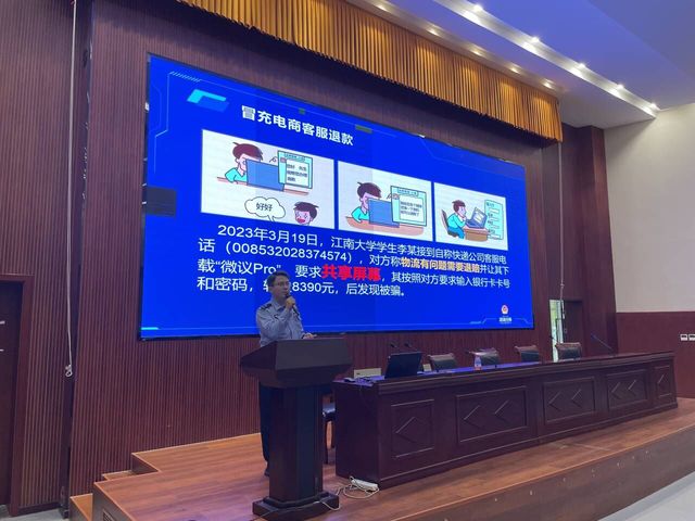为深入学习贯彻习近平总书记对打击治理电信网络诈骗犯罪工作的重要指示精神,提高学生对电信网络诈骗的识别应对能力,增强大学生网络安全意识,保障学生切身利益,维护安全文明校园,10月31日下午,外语与旅游学院在国际交流中心一楼报告厅组织2022级学生开展防范电信网络诈骗专题讲座。无锡市公安局滨湖分局雪浪派出所杨恺警官受邀出席为同学们授课,年级辅导员与2022级全体学生参加讲座。