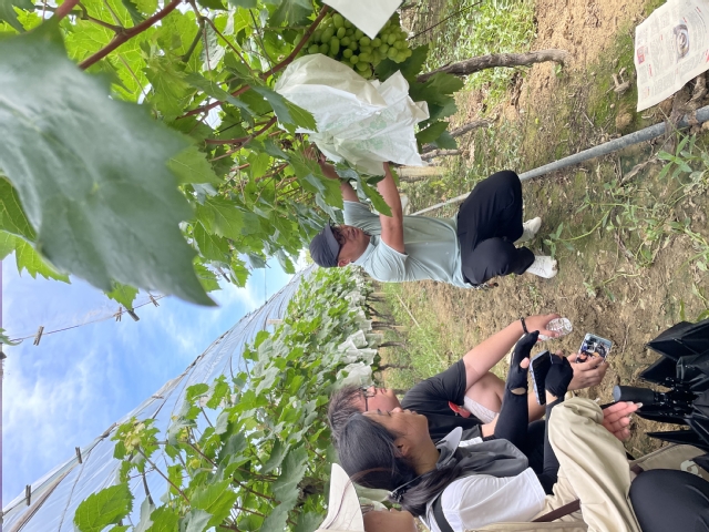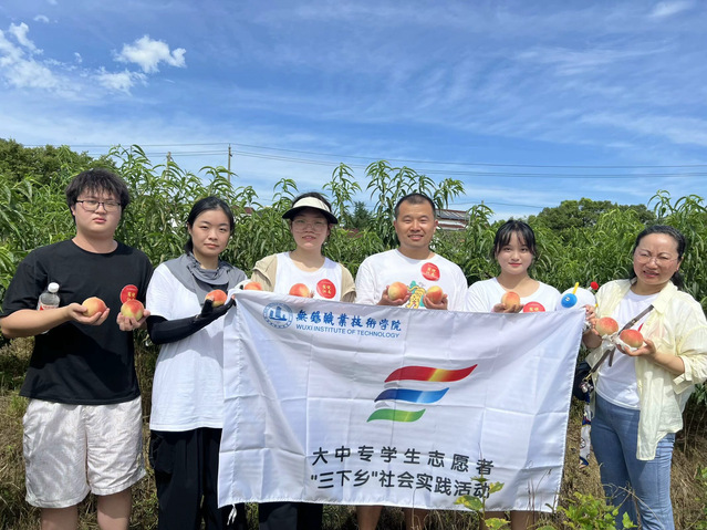 在农场负责人李功彬的带领下,实践团来到了白塔村自有的万亩方农场,深入田间地头果树园林,团队成员了解了南天竹、葡萄、柑橘等农产品的种植技巧,学会了如何正确摘收水蜜桃,并现场直播宣传白塔村特色农业,在学习农业生产技术知识的同时,更亲身体会到了果农辛勤劳动的艰辛与伟大。