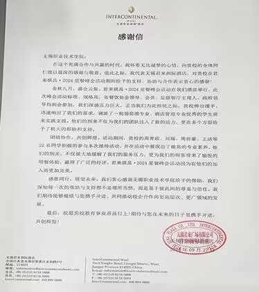 2024年9月26日,我院22名优秀学子在无锡君来洲际酒店举办的“君来祺昌2024星餐峰会”晚宴中,以其卓越的服务技能和专业素养,赢得了酒店及宾客的一致好评,充分展现专业教育实践成果。