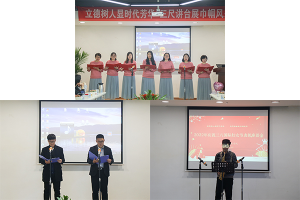 当天还为到场的属虎女教工赠送了纪念品,周勋勋、李丰两位老师的诗朗诵《巾帼芳华》代表全校男教工向女同胞们送上了浓浓的节日祝福,张啸老师用萨克斯演奏的《女人花》《听海》等曲目呈现了别样的音乐风格。校工会女工委员李湘等7位老师表演了小合唱校歌等曲目,展现当代女性爱岗敬业、用心生活的精神面貌。设计艺术学院林佳燕老师则以欢庆鼓乐的形式组织大家进行团队素质拓展,收获了好评。