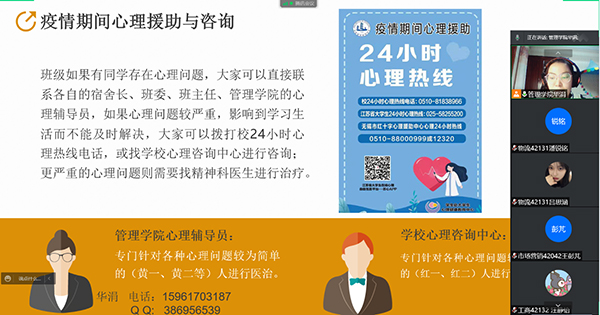 大家共同观看了影片《疫情下的我们》,了解了疫情防控状态下大学生最常见的十大心理问题,并通过解析心理问题特有的语言或行为征兆,提高了对常见心理问题的初步识别和预警能力,为校园突发疫情时能够做好学生心理健康工作打下良好的基础。师生们还就面对疫情该如何调适自我心理、如何开展特色的心理健康活动等问题进行了头脑风暴。