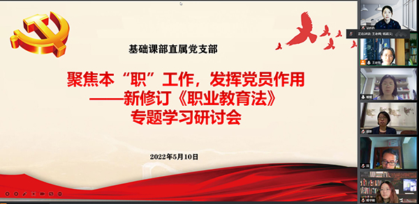 为落实全国职业教育大会精神和相关工作部署,以实际行动迎接党的二十大,根据习近平新时代中国特色社会主义思想和习近平总书记关于职业教育的重要指示精神,5月10日下午,基础课部直属党支部组织全体党员认真学习新修订《中华人民共和国职业教育法》。