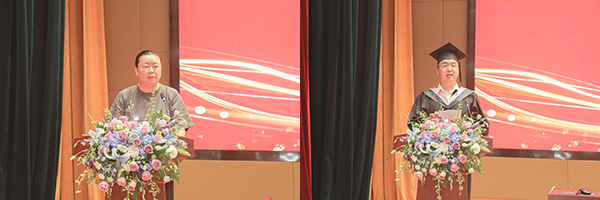 控制技术学院张楠老师作为教师代表发言,给同学们提出了三点建议:做一名品德高尚,有良好价值观的人;找准定位,树立人生目标,做一名持续奋斗的人;要继续学习,勇攀更高峰,做一位能力出众的人。市场营销41841班俞天善同学作为毕业生代表发言,他以句号、感叹号和省略号三个标点来总结自己的大学生活。