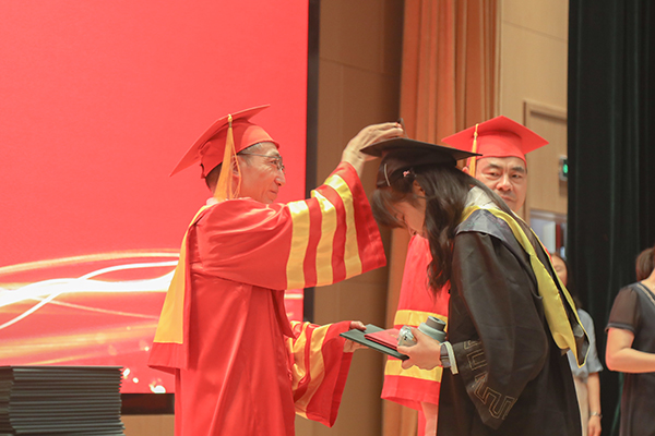 最后,朱爱胜书记和龚方红校长为全体现场毕业生颁发毕业证书和学位证书,龚方红为每一位毕业生行拨穗礼。参加毕业典礼的全部本科毕业生还与校领导及老师合影留念。