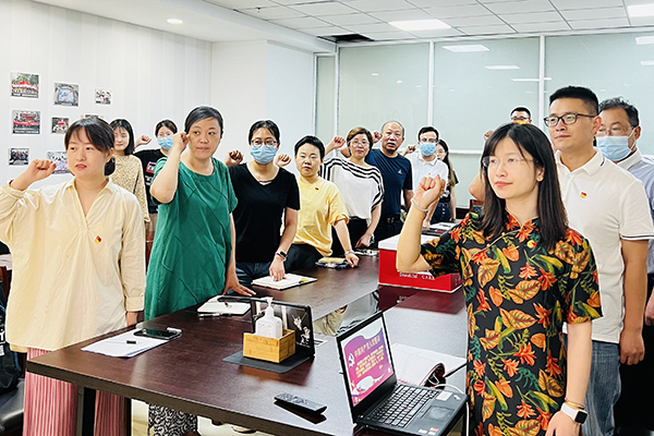 党员们观看学习了《一百堂党史课·馆长讲党史之中国国家博物馆:近距离感受中国梦凝聚的磅礴力量》视频。在回顾了中国共产党的百年征程之后,支部内老党员代表高敏同志和新党员代表陆玉洁分享了自己的入党故事。最后,全体党员在徐悦的带领下重温了入党誓词。