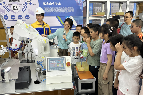 趣味科普课堂上,周丽老师带领同学们了解了学院增材制造、精密铸造、智能装备、工业视觉等实验室建设情况。职业体验课堂上,机电一体化技术专业主任唐霞老师带领创新团队学生成员,为同学们介绍了冬奥会飞扬火炬外壳打磨的科技,展示了自动导引小车运作、机械臂取材、数字模型和真实设备同步运行,让同学们了解了火炬打磨系统的出库、打磨、入库的全流程,同学们畅游在乐趣丰富的科技活动之中,感知科技的魅力。党史教育课堂上,学生第一党支部“红色讲解员”通过讲述建党与红船故事、播放视频“红色的故事”、红船手工制作等环节,推动学生党员当好“红船精神”的坚定捍卫者、忠实传承者、自觉践行者,在创新、奋斗、服务中学习实践中国共产党的建党精神,引导青少年听党话、感党恩、跟党走,树立理想,增长本领,立志成为社会主义建设者和接班人。