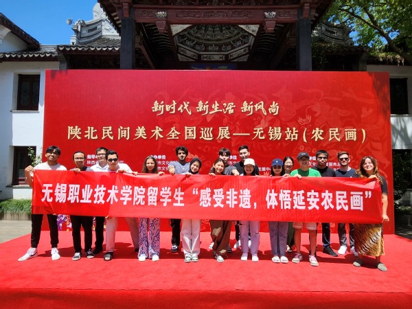 开幕式上,一曲清丽婉转的《太湖美》在古色古香的工字殿展厅映衬下,尽显无锡水乡的江南雅韵,使得留学生们沉醉其中。活动现场展出了近百幅具有陕北独特风格的、被列入陕西省第一批非遗名录的“陕北农民画”,均为延安市文化馆民间美术典藏精品,所展作品以讴歌新时代、展现新气象、表现人民群众美好生活的幸福场景为主要题材。它们构图奇美、想象力丰富、用色大胆,深受留学生们的喜爱,“这些色彩大胆又极具生活气息的民间画,是如此的生动有趣,仿佛亲历了乡村生活”来自泰国的留学生TOOBANTERNG MISS KULNAREE情不自禁感叹道。